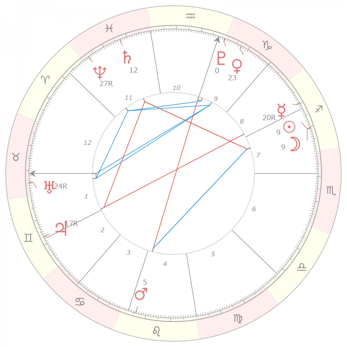 東京起点のホロスコープでは、射手座の太陽と月が7ハウスで重なり、11ハウスにある魚座の土星とスクエア(90度)を形成しています。また、牡牛座の天王星はアセンダントと合で、太陽と月とクインデチレ(165度)となっています。