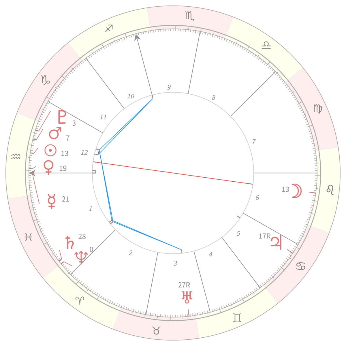月は獅子座、太陽が水瓶座にあり、向かい合っています。水瓶座には太陽の他に水星・金星・火星と個人天体が3つと冥王星が滞在していて、月以外の個人天体が全て水瓶座に集まっている配置です。